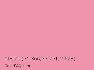 CIELCh 71.366,37.751,2.628 Color is a light rose color and the nearest color is Mauvelous #f091a9. Hex code #f094ad and RGB value is rgb(240,148,173). In RGB color space, this color is composed of 94% red, 58% green, 68% blue, In CMYK color space, this color is composed of 0% cyan, 38% magenta, 28% yellow , 6% black , In HSL color space, this color has a hue angle of 344° , 75% saturation and 76% lightness.