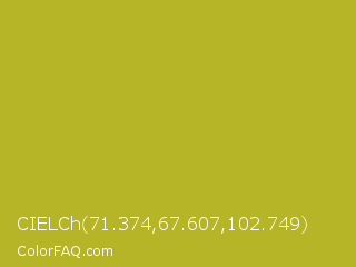 CIELCh 71.374,67.607,102.749 Color is a normal yellow color and the nearest color is Acid Green #b0bf1a. Hex code #b6b427 and RGB value is rgb(182,180,39). In RGB color space, this color is composed of 71% red, 71% green, 15% blue, In CMYK color space, this color is composed of 0% cyan, 1% magenta, 79% yellow , 29% black , In HSL color space, this color has a hue angle of 59° , 65% saturation and 43% lightness.