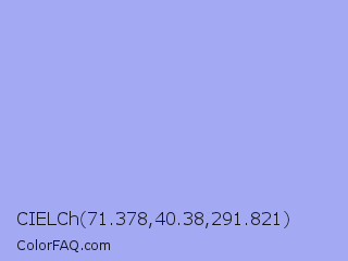 CIELCh 71.378,40.38,291.821 Color is a light blue color and the nearest color is Maximum Blue Purple #acace6. Hex code #a4a9f3 and RGB value is rgb(164,169,243). In RGB color space, this color is composed of 64% red, 66% green, 95% blue, In CMYK color space, this color is composed of 33% cyan, 30% magenta, 0% yellow , 5% black , In HSL color space, this color has a hue angle of 236° , 77% saturation and 80% lightness.