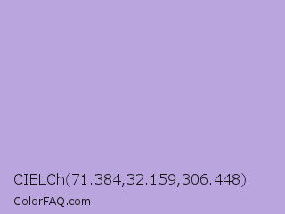CIELCh 71.384,32.159,306.448 Color is a light violet color and the nearest color is Light Pastel Purple #b19cd9. Hex code #bba5de and RGB value is rgb(187,165,222). In RGB color space, this color is composed of 73% red, 65% green, 87% blue, In CMYK color space, this color is composed of 16% cyan, 26% magenta, 0% yellow , 13% black , In HSL color space, this color has a hue angle of 263° , 46% saturation and 76% lightness.