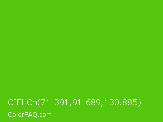 CIELCh 71.391,91.689,130.885 Color is a normal green color and the nearest color is Kelly Green #4cbb17. Hex code #54c70c and RGB value is rgb(84,199,12). In RGB color space, this color is composed of 33% red, 78% green, 5% blue, In CMYK color space, this color is composed of 58% cyan, 0% magenta, 94% yellow , 22% black , In HSL color space, this color has a hue angle of 97° , 89% saturation and 41% lightness.
