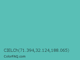 CIELCh 71.394,32.124,188.065 Color is a normal cyan color and the nearest color is Fountain Blue #56b4be. Hex code #59bfb6 and RGB value is rgb(89,191,182). In RGB color space, this color is composed of 35% red, 75% green, 71% blue, In CMYK color space, this color is composed of 53% cyan, 0% magenta, 5% yellow , 25% black , In HSL color space, this color has a hue angle of 175° , 44% saturation and 55% lightness.