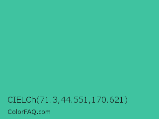 CIELCh 71.3,44.551,170.621 Color is a normal cyan color and the nearest color is Puerto Rico #3fc1aa. Hex code #3fc3a0 and RGB value is rgb(63,195,160). In RGB color space, this color is composed of 25% red, 76% green, 63% blue, In CMYK color space, this color is composed of 68% cyan, 0% magenta, 18% yellow , 24% black , In HSL color space, this color has a hue angle of 164° , 52% saturation and 51% lightness.