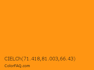 CIELCh 71.418,81.003,66.43 Color is a normal orange color and the nearest color is West Side #ff910f. Hex code #ff9512 and RGB value is rgb(255,149,18). In RGB color space, this color is composed of 100% red, 58% green, 7% blue, In CMYK color space, this color is composed of 0% cyan, 42% magenta, 93% yellow , 0% black , In HSL color space, this color has a hue angle of 33° , 100% saturation and 54% lightness.