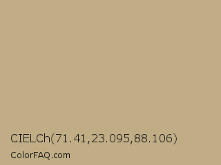 CIELCh 71.41,23.095,88.106 Color is a light orange color and the nearest color is Sand Ecru #c2b280. Hex code #c0ad85 and RGB value is rgb(192,173,133). In RGB color space, this color is composed of 75% red, 68% green, 52% blue, In CMYK color space, this color is composed of 0% cyan, 10% magenta, 31% yellow , 25% black , In HSL color space, this color has a hue angle of 41° , 32% saturation and 64% lightness.