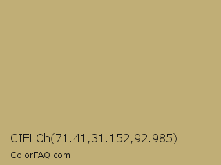 CIELCh 71.41,31.152,92.985 Color is a light orange color and the nearest color is Misty Moss #bbb477. Hex code #c0ae76 and RGB value is rgb(192,174,118). In RGB color space, this color is composed of 75% red, 68% green, 46% blue, In CMYK color space, this color is composed of 0% cyan, 9% magenta, 39% yellow , 25% black , In HSL color space, this color has a hue angle of 45° , 37% saturation and 61% lightness.