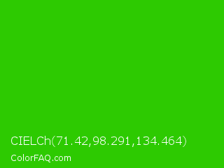 CIELCh 71.42,98.291,134.464 Color is a normal green color and the nearest color is Harlequin Green #46cb18. Hex code #2dca01 and RGB value is rgb(45,202,1). In RGB color space, this color is composed of 18% red, 79% green, 0% blue, In CMYK color space, this color is composed of 78% cyan, 0% magenta, 100% yellow , 21% black , In HSL color space, this color has a hue angle of 107° , 99% saturation and 40% lightness.