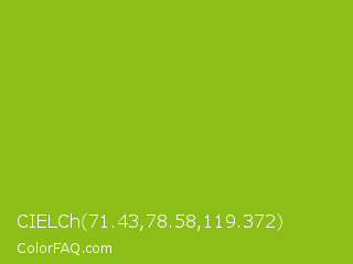 CIELCh 71.43,78.58,119.372 Color is a normal lime color and the nearest color is Lima #76bd17. Hex code #8bbf18 and RGB value is rgb(139,191,24). In RGB color space, this color is composed of 55% red, 75% green, 9% blue, In CMYK color space, this color is composed of 27% cyan, 0% magenta, 87% yellow , 25% black , In HSL color space, this color has a hue angle of 79° , 78% saturation and 42% lightness.