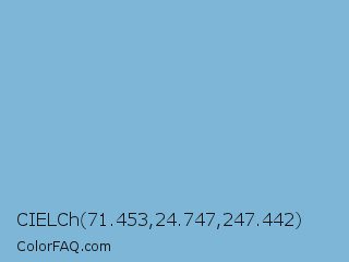 CIELCh 71.453,24.747,247.442 Color is a light blue color and the nearest color is Dark Sky Blue #8cbed6. Hex code #7eb6d8 and RGB value is rgb(126,182,216). In RGB color space, this color is composed of 49% red, 71% green, 85% blue, In CMYK color space, this color is composed of 42% cyan, 16% magenta, 0% yellow , 15% black , In HSL color space, this color has a hue angle of 203° , 54% saturation and 67% lightness.