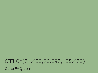 CIELCh 71.453,26.897,135.473 Color is a light green color and the nearest color is Dark Sea Green #8fbc8f. Hex code #98b88c and RGB value is rgb(152,184,140). In RGB color space, this color is composed of 60% red, 72% green, 55% blue, In CMYK color space, this color is composed of 17% cyan, 0% magenta, 24% yellow , 28% black , In HSL color space, this color has a hue angle of 104° , 24% saturation and 64% lightness.