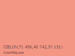 CIELCh 71.456,40.742,37.131 Color is a light red color and the nearest color is Vivid Tangerine #ff9980. Hex code #f39784 and RGB value is rgb(243,151,132). In RGB color space, this color is composed of 95% red, 59% green, 52% blue, In CMYK color space, this color is composed of 0% cyan, 38% magenta, 46% yellow , 5% black , In HSL color space, this color has a hue angle of 10° , 82% saturation and 74% lightness.