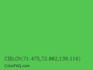 CIELCh 71.475,72.882,139.116 Color is a normal green color and the nearest color is Fern #63b76c. Hex code #54c652 and RGB value is rgb(84,198,82). In RGB color space, this color is composed of 33% red, 78% green, 32% blue, In CMYK color space, this color is composed of 58% cyan, 0% magenta, 59% yellow , 22% black , In HSL color space, this color has a hue angle of 119° , 50% saturation and 55% lightness.