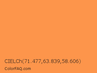 CIELCh 71.477,63.839,58.606 Color is a light orange color and the nearest color is Neon Carrot #ffa343. Hex code #fd954b and RGB value is rgb(253,149,75). In RGB color space, this color is composed of 99% red, 58% green, 29% blue, In CMYK color space, this color is composed of 0% cyan, 41% magenta, 70% yellow , 1% black , In HSL color space, this color has a hue angle of 25° , 98% saturation and 64% lightness.