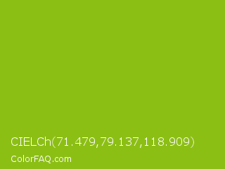 CIELCh 71.479,79.137,118.909 Color is a normal lime color and the nearest color is Pistachio Green #9dc209. Hex code #8cbf14 and RGB value is rgb(140,191,20). In RGB color space, this color is composed of 55% red, 75% green, 8% blue, In CMYK color space, this color is composed of 27% cyan, 0% magenta, 90% yellow , 25% black , In HSL color space, this color has a hue angle of 78° , 81% saturation and 41% lightness.