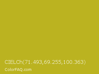 CIELCh 71.493,69.255,100.363 Color is a normal yellow color and the nearest color is Acid Green #b0bf1a. Hex code #bbb320 and RGB value is rgb(187,179,32). In RGB color space, this color is composed of 73% red, 70% green, 13% blue, In CMYK color space, this color is composed of 0% cyan, 4% magenta, 83% yellow , 27% black , In HSL color space, this color has a hue angle of 57° , 71% saturation and 43% lightness.