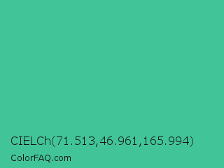 CIELCh 71.513,46.961,165.994 Color is a normal green color and the nearest color is Ocean Green #48bf91. Hex code #42c499 and RGB value is rgb(66,196,153). In RGB color space, this color is composed of 26% red, 77% green, 60% blue, In CMYK color space, this color is composed of 66% cyan, 0% magenta, 22% yellow , 23% black , In HSL color space, this color has a hue angle of 160° , 52% saturation and 51% lightness.