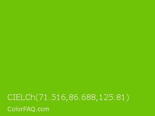 CIELCh 71.516,86.688,125.81 Color is a normal green color and the nearest color is Lima #76bd17. Hex code #70c408 and RGB value is rgb(112,196,8). In RGB color space, this color is composed of 44% red, 77% green, 3% blue, In CMYK color space, this color is composed of 43% cyan, 0% magenta, 96% yellow , 23% black , In HSL color space, this color has a hue angle of 87° , 92% saturation and 40% lightness.