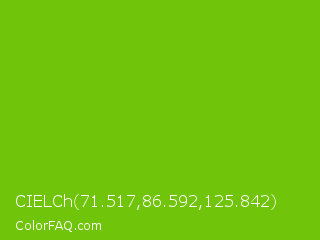 CIELCh 71.517,86.592,125.842 Color is a normal green color and the nearest color is Lima #76bd17. Hex code #70c409 and RGB value is rgb(112,196,9). In RGB color space, this color is composed of 44% red, 77% green, 4% blue, In CMYK color space, this color is composed of 43% cyan, 0% magenta, 95% yellow , 23% black , In HSL color space, this color has a hue angle of 87° , 91% saturation and 40% lightness.