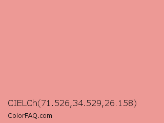 CIELCh 71.526,34.529,26.158 Color is a light red color and the nearest color is Sea Pink #ed989e. Hex code #ed9995 and RGB value is rgb(237,153,149). In RGB color space, this color is composed of 93% red, 60% green, 58% blue, In CMYK color space, this color is composed of 0% cyan, 35% magenta, 37% yellow , 7% black , In HSL color space, this color has a hue angle of 3° , 71% saturation and 76% lightness.