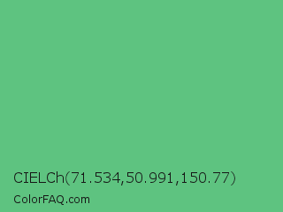 CIELCh 71.534,50.991,150.77 Color is a normal green color and the nearest color is Emerald #50c878. Hex code #5ec380 and RGB value is rgb(94,195,128). In RGB color space, this color is composed of 37% red, 76% green, 50% blue, In CMYK color space, this color is composed of 52% cyan, 0% magenta, 34% yellow , 24% black , In HSL color space, this color has a hue angle of 140° , 46% saturation and 57% lightness.