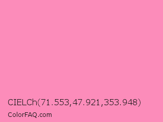 CIELCh 71.553,47.921,353.948 Color is a light rose color and the nearest color is Schauss Pink #ff91af. Hex code #fc8cba and RGB value is rgb(252,140,186). In RGB color space, this color is composed of 99% red, 55% green, 73% blue, In CMYK color space, this color is composed of 0% cyan, 44% magenta, 26% yellow , 1% black , In HSL color space, this color has a hue angle of 335° , 95% saturation and 77% lightness.