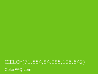 CIELCh 71.554,84.285,126.642 Color is a normal green color and the nearest color is Lima #76bd17. Hex code #70c41a and RGB value is rgb(112,196,26). In RGB color space, this color is composed of 44% red, 77% green, 10% blue, In CMYK color space, this color is composed of 43% cyan, 0% magenta, 87% yellow , 23% black , In HSL color space, this color has a hue angle of 90° , 77% saturation and 44% lightness.