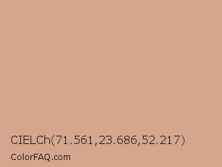 CIELCh 71.561,23.686,52.217 Color is a light orange color and the nearest color is Tumbleweed #deaa88. Hex code #d5a58e and RGB value is rgb(213,165,142). In RGB color space, this color is composed of 84% red, 65% green, 56% blue, In CMYK color space, this color is composed of 0% cyan, 23% magenta, 33% yellow , 16% black , In HSL color space, this color has a hue angle of 19° , 46% saturation and 70% lightness.