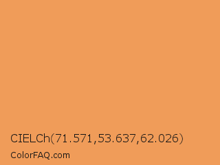CIELCh 71.571,53.637,62.026 Color is a light orange color and the nearest color is Tan Hide #fa9d5a. Hex code #f09c59 and RGB value is rgb(240,156,89). In RGB color space, this color is composed of 94% red, 61% green, 35% blue, In CMYK color space, this color is composed of 0% cyan, 35% magenta, 63% yellow , 6% black , In HSL color space, this color has a hue angle of 27° , 83% saturation and 65% lightness.