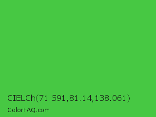 CIELCh 71.591,81.14,138.061 Color is a normal green color and the nearest color is Lime Green #32cd32. Hex code #47c843 and RGB value is rgb(71,200,67). In RGB color space, this color is composed of 28% red, 78% green, 26% blue, In CMYK color space, this color is composed of 65% cyan, 0% magenta, 67% yellow , 22% black , In HSL color space, this color has a hue angle of 118° , 55% saturation and 52% lightness.