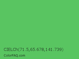 CIELCh 71.5,65.678,141.739 Color is a normal green color and the nearest color is Fern #63b76c. Hex code #59c561 and RGB value is rgb(89,197,97). In RGB color space, this color is composed of 35% red, 77% green, 38% blue, In CMYK color space, this color is composed of 55% cyan, 0% magenta, 51% yellow , 23% black , In HSL color space, this color has a hue angle of 124° , 48% saturation and 56% lightness.