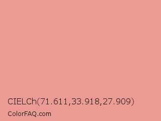CIELCh 71.611,33.918,27.909 Color is a light red color and the nearest color is Sea Pink #ed989e. Hex code #ec9a94 and RGB value is rgb(236,154,148). In RGB color space, this color is composed of 93% red, 60% green, 58% blue, In CMYK color space, this color is composed of 0% cyan, 35% magenta, 37% yellow , 7% black , In HSL color space, this color has a hue angle of 4° , 70% saturation and 75% lightness.
