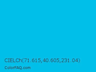 CIELCh 71.615,40.605,231.04 Color is a normal cyan color and the nearest color is Cyan Process #00b7eb. Hex code #00bfe8 and RGB value is rgb(0,191,232). In RGB color space, this color is composed of 0% red, 75% green, 91% blue, In CMYK color space, this color is composed of 100% cyan, 18% magenta, 0% yellow , 9% black , In HSL color space, this color has a hue angle of 191° , 100% saturation and 45% lightness.