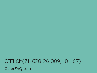 CIELCh 71.628,26.389,181.67 Color is a normal cyan color and the nearest color is Neptune #7cb7bb. Hex code #72bdb0 and RGB value is rgb(114,189,176). In RGB color space, this color is composed of 45% red, 74% green, 69% blue, In CMYK color space, this color is composed of 40% cyan, 0% magenta, 7% yellow , 26% black , In HSL color space, this color has a hue angle of 170° , 36% saturation and 59% lightness.
