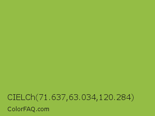 CIELCh 71.637,63.034,120.284 Color is a normal green color and the nearest color is Android Green #a4c639. Hex code #94bd45 and RGB value is rgb(148,189,69). In RGB color space, this color is composed of 58% red, 74% green, 27% blue, In CMYK color space, this color is composed of 22% cyan, 0% magenta, 63% yellow , 26% black , In HSL color space, this color has a hue angle of 81° , 48% saturation and 51% lightness.