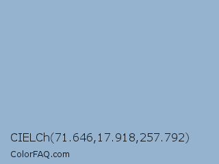 CIELCh 71.646,17.918,257.792 Color is a light blue color and the nearest color is Rock Blue #9eb1cd. Hex code #95b3cf and RGB value is rgb(149,179,207). In RGB color space, this color is composed of 58% red, 70% green, 81% blue, In CMYK color space, this color is composed of 28% cyan, 14% magenta, 0% yellow , 19% black , In HSL color space, this color has a hue angle of 209° , 38% saturation and 70% lightness.