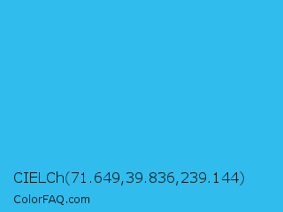 CIELCh 71.649,39.836,239.144 Color is a normal blue color and the nearest color is Picton Blue #45b1e8. Hex code #30bded and RGB value is rgb(48,189,237). In RGB color space, this color is composed of 19% red, 74% green, 93% blue, In CMYK color space, this color is composed of 80% cyan, 20% magenta, 0% yellow , 7% black , In HSL color space, this color has a hue angle of 195° , 84% saturation and 56% lightness.