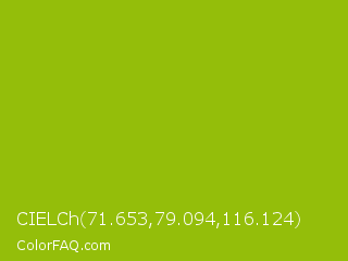 CIELCh 71.653,79.094,116.124 Color is a normal lime color and the nearest color is Pistachio Green #9dc209. Hex code #94be0a and RGB value is rgb(148,190,10). In RGB color space, this color is composed of 58% red, 75% green, 4% blue, In CMYK color space, this color is composed of 22% cyan, 0% magenta, 95% yellow , 25% black , In HSL color space, this color has a hue angle of 74° , 90% saturation and 39% lightness.