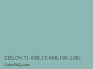 CIELCh 71.658,15.668,190.128 Color is a light cyan color and the nearest color is Summer Green #96bbab. Hex code #8cb8b4 and RGB value is rgb(140,184,180). In RGB color space, this color is composed of 55% red, 72% green, 71% blue, In CMYK color space, this color is composed of 24% cyan, 0% magenta, 2% yellow , 28% black , In HSL color space, this color has a hue angle of 175° , 24% saturation and 64% lightness.