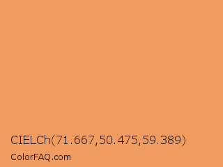 CIELCh 71.667,50.475,59.389 Color is a light orange color and the nearest color is Sandy Brown #f4a460. Hex code #f09c61 and RGB value is rgb(240,156,97). In RGB color space, this color is composed of 94% red, 61% green, 38% blue, In CMYK color space, this color is composed of 0% cyan, 35% magenta, 60% yellow , 6% black , In HSL color space, this color has a hue angle of 25° , 83% saturation and 66% lightness.