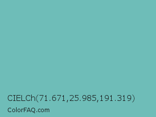 CIELCh 71.671,25.985,191.319 Color is a normal cyan color and the nearest color is Neptune #7cb7bb. Hex code #6ebdb8 and RGB value is rgb(110,189,184). In RGB color space, this color is composed of 43% red, 74% green, 72% blue, In CMYK color space, this color is composed of 42% cyan, 0% magenta, 3% yellow , 26% black , In HSL color space, this color has a hue angle of 176° , 37% saturation and 59% lightness.