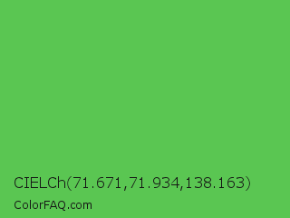 CIELCh 71.671,71.934,138.163 Color is a normal green color and the nearest color is Fern #63b76c. Hex code #5ac652 and RGB value is rgb(90,198,82). In RGB color space, this color is composed of 35% red, 78% green, 32% blue, In CMYK color space, this color is composed of 55% cyan, 0% magenta, 59% yellow , 22% black , In HSL color space, this color has a hue angle of 116° , 50% saturation and 55% lightness.