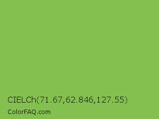 CIELCh 71.67,62.846,127.55 Color is a normal green color and the nearest color is Bud Green #7bb661. Hex code #84c04f and RGB value is rgb(132,192,79). In RGB color space, this color is composed of 52% red, 75% green, 31% blue, In CMYK color space, this color is composed of 31% cyan, 0% magenta, 59% yellow , 25% black , In HSL color space, this color has a hue angle of 92° , 47% saturation and 53% lightness.