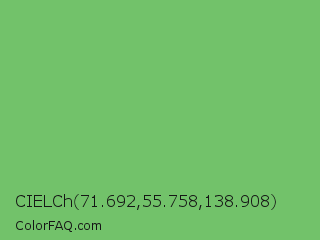 CIELCh 71.692,55.758,138.908 Color is a normal green color and the nearest color is Mantis #74c365. Hex code #72c26a and RGB value is rgb(114,194,106). In RGB color space, this color is composed of 45% red, 76% green, 42% blue, In CMYK color space, this color is composed of 41% cyan, 0% magenta, 45% yellow , 24% black , In HSL color space, this color has a hue angle of 115° , 42% saturation and 59% lightness.