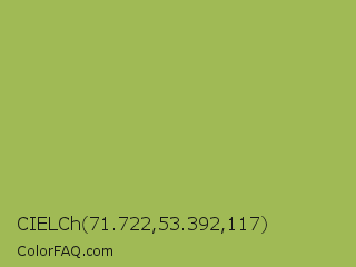 CIELCh 71.722,53.392,117 Color is a normal lime color and the nearest color is Middle Green Yellow #acbf60. Hex code #a0ba55 and RGB value is rgb(160,186,85). In RGB color space, this color is composed of 63% red, 73% green, 33% blue, In CMYK color space, this color is composed of 14% cyan, 0% magenta, 54% yellow , 27% black , In HSL color space, this color has a hue angle of 75° , 42% saturation and 53% lightness.