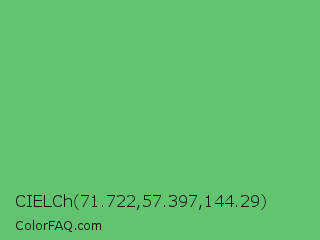 CIELCh 71.722,57.397,144.29 Color is a normal green color and the nearest color is Fern #63b76c. Hex code #62c470 and RGB value is rgb(98,196,112). In RGB color space, this color is composed of 38% red, 77% green, 44% blue, In CMYK color space, this color is composed of 50% cyan, 0% magenta, 43% yellow , 23% black , In HSL color space, this color has a hue angle of 129° , 45% saturation and 58% lightness.