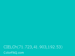 CIELCh 71.723,41.903,192.53 Color is a normal cyan color and the nearest color is Turquoise Surf #00c5cd. Hex code #01c4bf and RGB value is rgb(1,196,191). In RGB color space, this color is composed of 0% red, 77% green, 75% blue, In CMYK color space, this color is composed of 99% cyan, 0% magenta, 3% yellow , 23% black , In HSL color space, this color has a hue angle of 178° , 99% saturation and 39% lightness.