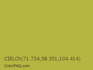 CIELCh 71.734,58.351,104.414 Color is a normal yellow color and the nearest color is Brass #b5a642. Hex code #b5b542 and RGB value is rgb(181,181,66). In RGB color space, this color is composed of 71% red, 71% green, 26% blue, In CMYK color space, this color is composed of 0% cyan, 0% magenta, 64% yellow , 29% black , In HSL color space, this color has a hue angle of 60° , 47% saturation and 48% lightness.