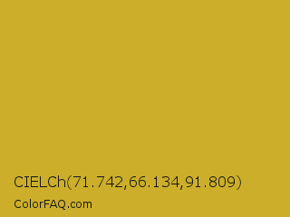 CIELCh 71.742,66.134,91.809 Color is a normal yellow color and the nearest color is Hokey Pokey #c8a528. Hex code #ccae2a and RGB value is rgb(204,174,42). In RGB color space, this color is composed of 80% red, 68% green, 16% blue, In CMYK color space, this color is composed of 0% cyan, 15% magenta, 79% yellow , 20% black , In HSL color space, this color has a hue angle of 49° , 66% saturation and 48% lightness.