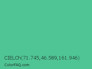 CIELCh 71.745,46.589,161.946 Color is a normal green color and the nearest color is Ocean Green #48bf91. Hex code #4fc494 and RGB value is rgb(79,196,148). In RGB color space, this color is composed of 31% red, 77% green, 58% blue, In CMYK color space, this color is composed of 60% cyan, 0% magenta, 24% yellow , 23% black , In HSL color space, this color has a hue angle of 155° , 50% saturation and 54% lightness.