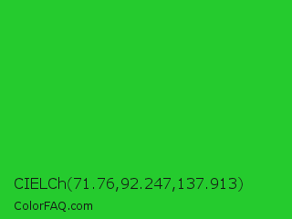 CIELCh 71.76,92.247,137.913 Color is a normal green color and the nearest color is Lime Green #32cd32. Hex code #25cb2e and RGB value is rgb(37,203,46). In RGB color space, this color is composed of 15% red, 80% green, 18% blue, In CMYK color space, this color is composed of 82% cyan, 0% magenta, 77% yellow , 20% black , In HSL color space, this color has a hue angle of 123° , 69% saturation and 47% lightness.